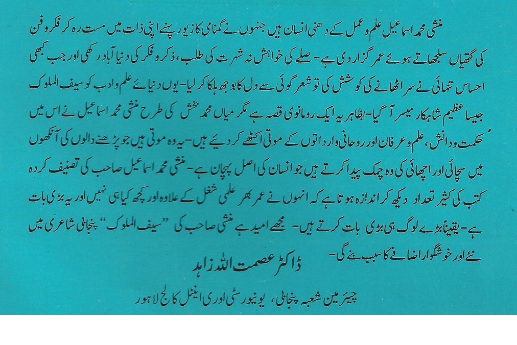 Muhammad Ismail ( رحمتہ اللہ علیہ ) was a great Scholar & Sufi from “Kund Panjeri, Bhimber (Mirpur) Azad Kashmir Pakistan”. He authored 94 Sufi & religious books in Punjabi poetry form, and have a great spiritual poetry collection. He was the student of Ustad ul Ulmah Hazrat Molanah Muhammad Nabi Baksh Halwaai ( رحمتہ اللہ علیہ ) ”May ALLAH shower HIS mercy upon him” from (Dehli Gate) Lahore Pakistan .